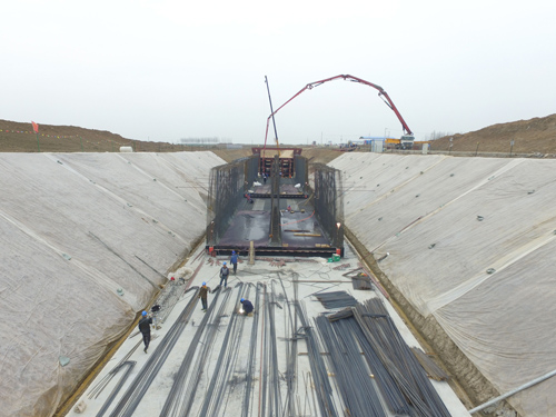 3月的鄂北大地,春风送暖,正是工程建设的大好时期。在鄂北水资源配置工程3标的施工现场,只见机声轰隆,天泵长臂挥舞,工程正在如火如荼的开展。从主体工程第一仓混凝土浇筑至今,已完成垫层混凝土浇筑长度315m、暗涵底板混凝土浇筑长度75m。暗涵墙身及顶板的钢筋、模板安装正在同步开展,6个土方开挖断面正有条不紊的持续推进。