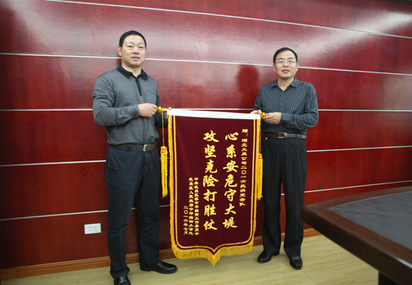 10月21日下午,武昌区中华路街党工委书记王妍、办事处主任夏家新等街道领导送来了“攻坚克险打胜仗、心系安危守大堤”的锦旗,对公司积极组织并参与防汛抗洪工作表示感谢。余中平董事长代表公司接受锦旗,感谢街道长期以来的关心和帮助,并表示将一如既往地支持辖区建设,服务辖区群众,为民办好事、办实事。