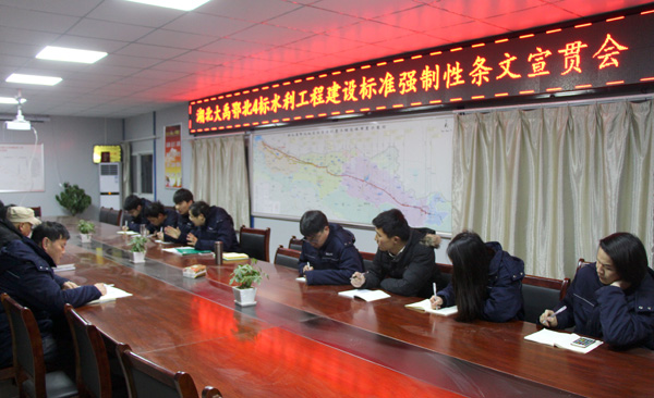 为贯彻落实《中华人民共和国标准化法实施条例》、《建设工程质量管理条例》和《建设工程安全生产管理条例》等有关规定,不断提高水利工程建设质量,保障工程安全,鄂北4标项目部于2月21日召开了《水利工程建设标准强制性条文》(2016年版)宣贯会。