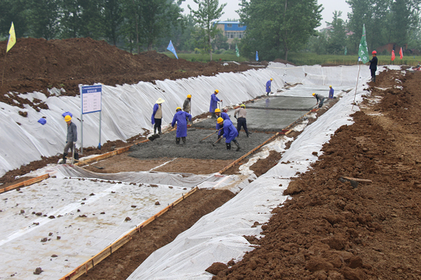 吴庄明渠下排洪涵洞全长113.71m,由植生块护坡、护坦、进口段、箱涵、消力池段、海漫段组成。箱涵净宽3.3m,净高2.0m,长11.98m,总共6节。排洪涵洞总共划分为25个单元,其中重要隐蔽单元1个(土方开挖)。关键部位4个(分别是箱涵首尾两端箱涵的底板,和墙身及顶板)。排洪涵洞设计流量14.4m³/s,校核流量17.9m³/s,修建完成后用于汛期排洪以及周边农田灌溉。(生产管理办公室 王征 第二工程公司 於欢)