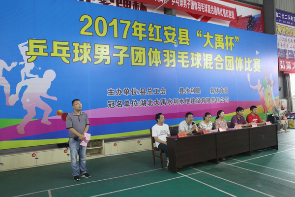 一年好景六月天,良辰盛会喜空前。6月23-25日,由红安县总工会、县水利局、县体育局主办,公司冠名的2017年红安县“伟德国际victor1946杯”羽毛球混合团体比赛在革命圣地红安县隆重举行。红安县副县长刘红英出席开幕式并宣布比赛开始,县委宣传部副部长刘应军代表组委会致辞,主办单位负责人参加开幕式,公司监事会主席胡刚参加开幕式并致辞。