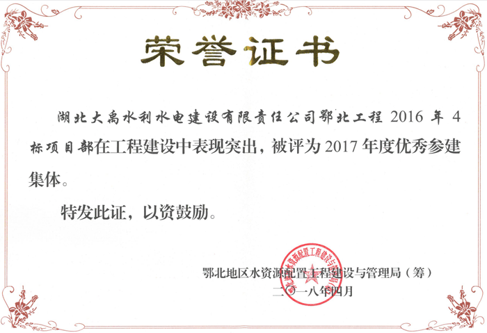 为了全面提升和促进鄂北工程建设, 4月26日鄂北局在枣阳召开鄂北工程推进会。会议由鄂北局党委书记、局长李庆国主持,所有参建单位参与此次会议。会上表彰了2017年度的先进个人和优秀集体,鄂北工程2016年4标项目部喜获优秀参建集体的荣誉称号!