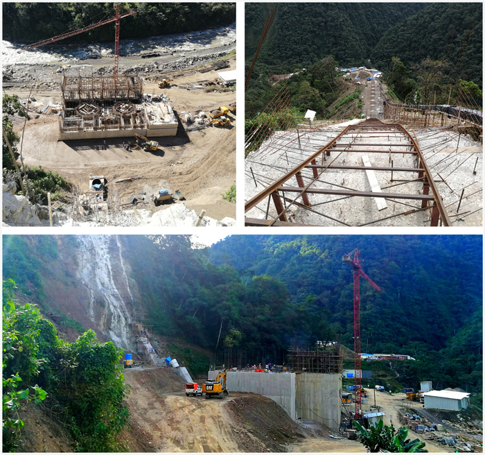公司承建的玻利维亚圣何塞2级水电站(引水发电式,最大净水头为360m、设计净水头342m、最小净水头332m,设计引用水量23m³/s,年发电量为407GWh)土建、金属结构和机电安装相关施工正在紧张进行。目前管槽镇墩、支墩一期混凝土已基本完成,管槽压力钢管轨道安装已完成75%;隧洞压力钢管已安装65m,埋管混凝土已浇筑63m;主厂房土建和机电安装已完成球阀层、机墩风罩层、厂房边墙、副厂房楼板等施工,即将完成发电机层施工,厂房安装间已完成发电层各项施工,厂房上游土石回填已完成55%;补偿水库放空管已完成第一段开挖和钢管预埋,岔管上游贴坡混凝土等正在有序施工中。