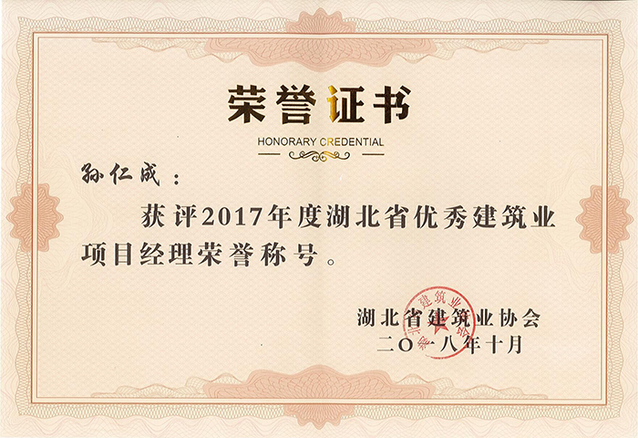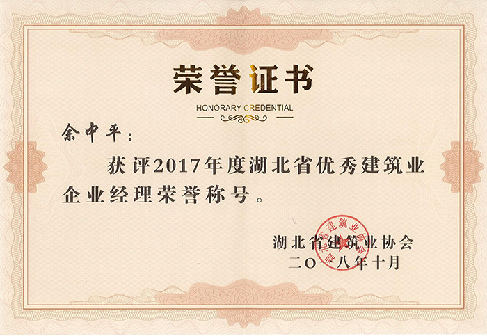 近日,2017年度湖北省优秀建筑业企业经理及项目经理评选结果揭晓,公司董事长兼总经理余中平同志荣获“2017年度湖北省优秀建筑业企业经理”称号,项目经理孙仁成同志荣获“2017年度湖北省优秀建筑业企业项目经理”称号。