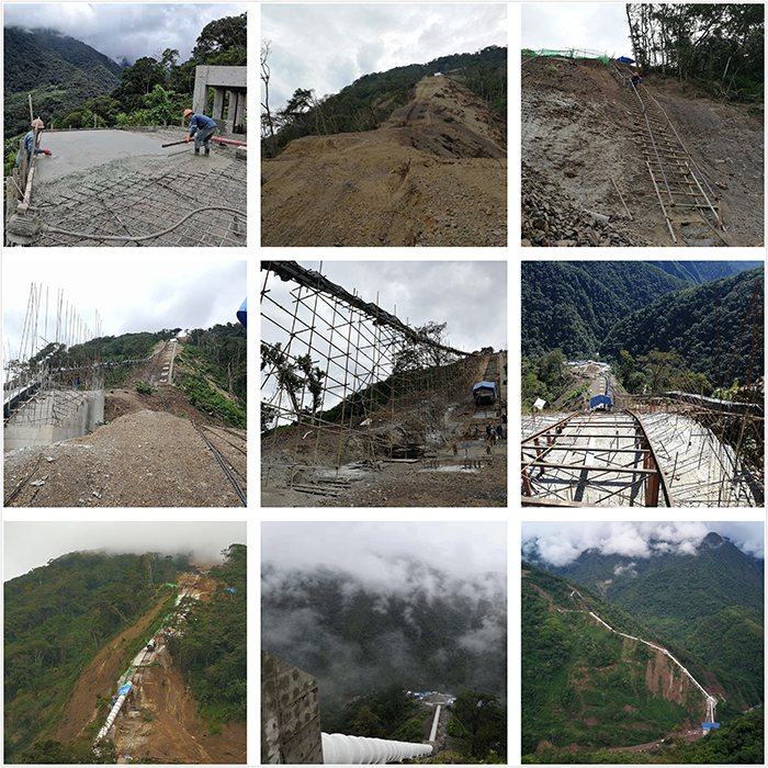 回望圣何塞管槽施工历程,一幕幕画面次序展开:深夜会议室中热烈讨论的声音,陡峭山坡上肩扛手提的身影,崎岖山路间运输不息的车辆,风雨里坚持不懈的人群……所有的这一切汇成了一条蜿蜒的小路、一座浇筑的溜槽和一道安装的轨道,最终铸成了一条钢铁长龙(压力钢管)和一路坚强利爪(镇墩支墩),成为了圣何塞2级站的“五个一工程”。