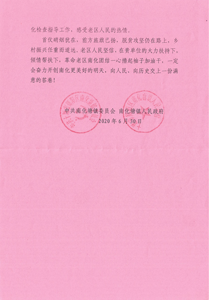 对此,十堰市南化塘镇政府特地向碾盘山枢纽工程项目部送来感谢信。这一封感谢信既是对碾盘山枢纽工程项目部员工热心援助的感激之情,也彰显了公司一直积极践行社会责任,积极地响应了国家精准扶贫号召,和我们不忘初心、勇担责任的企业形象。(第二工程公司 胡振洲)
