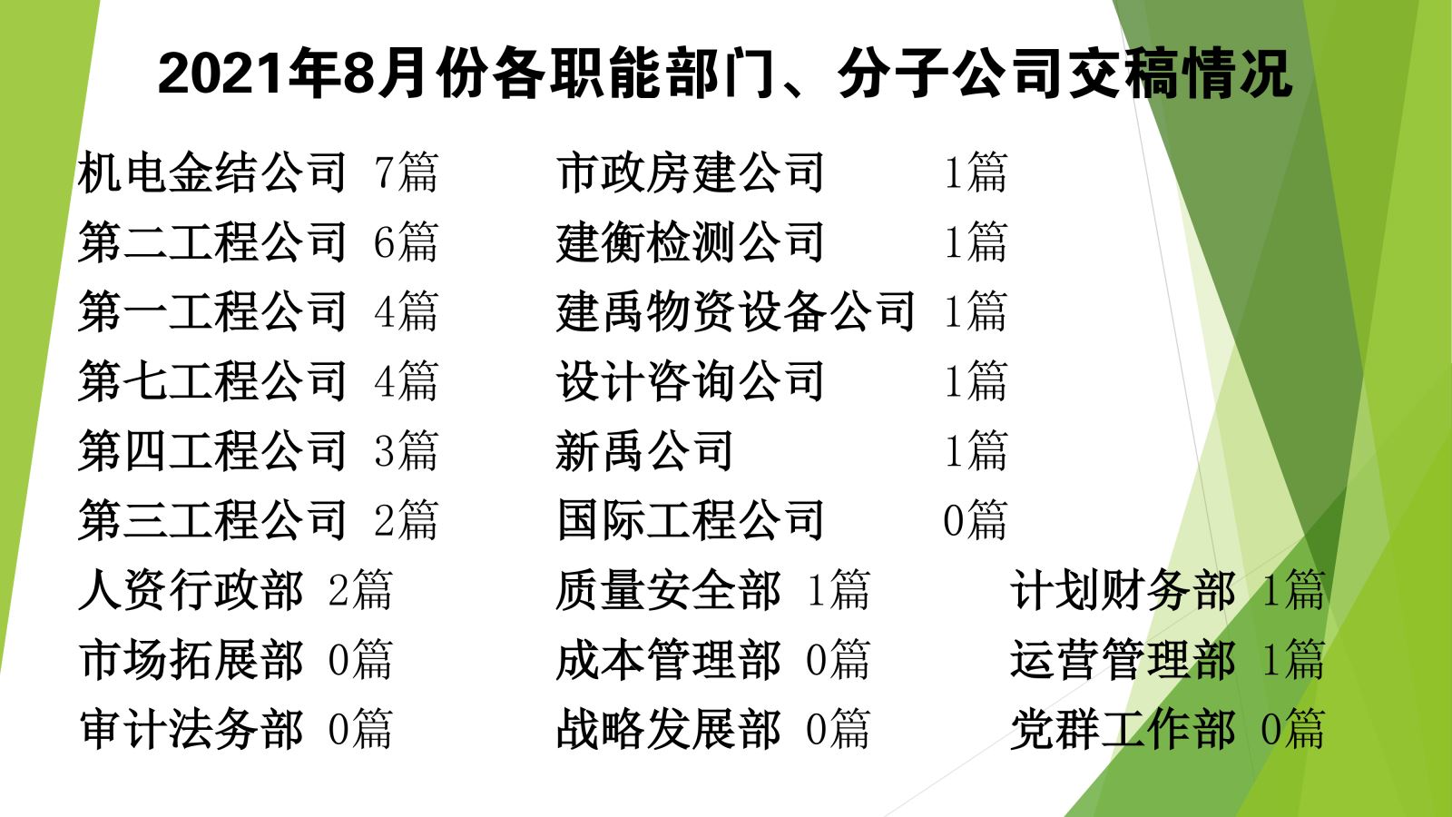 2021年8月份各职能部门、分子公司交稿情况