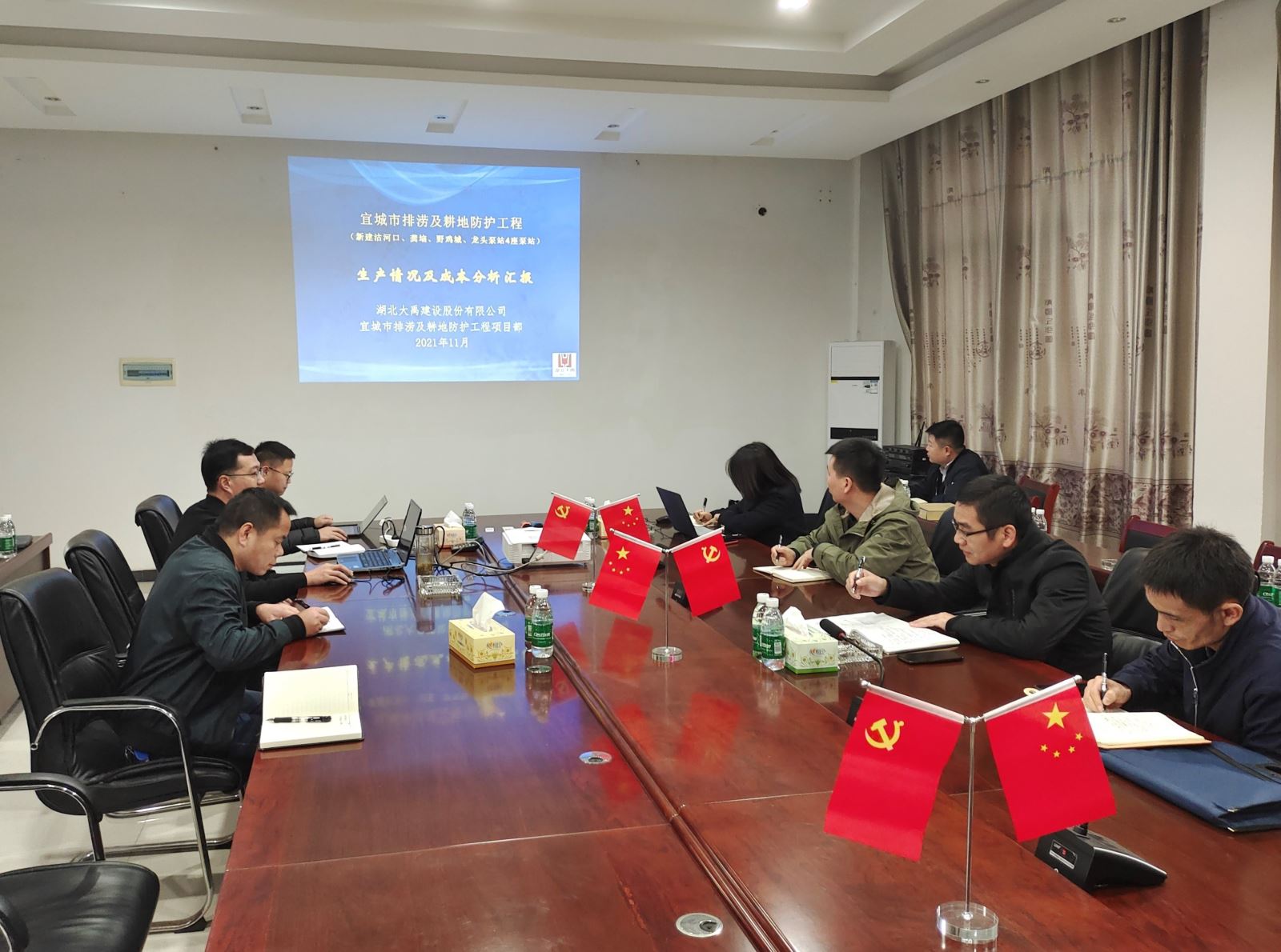 2021年11月20日,公司总经理助理罗应军,运营管理部、成本管理部、计划财务部主要负责人赴宜城市排涝及耕地防护工程项目部进行检查。罗应军一行查看施工现场后,在项目部召开碰头会,项目负责人分别对项目生产情况、成本分析和信息化等各方面进行了汇报,随后公司领导就相关问题进行了分析和探讨,并提出了解决办法。对于公司重点项目常态化巡查、智能化管理提出了更高的要求。