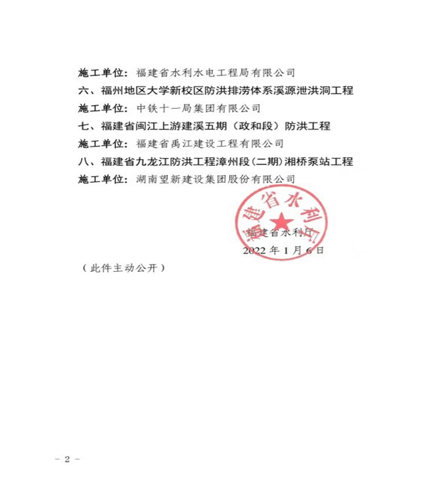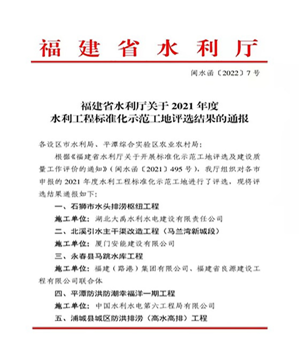 2022年1月6日,福建省水利厅发文通报了2021年度水利工程标准化示范工地的评选结果。石狮市水头排涝枢纽工程以总分排名第一的位置被评为2021年度水利工程标准化示范工地。