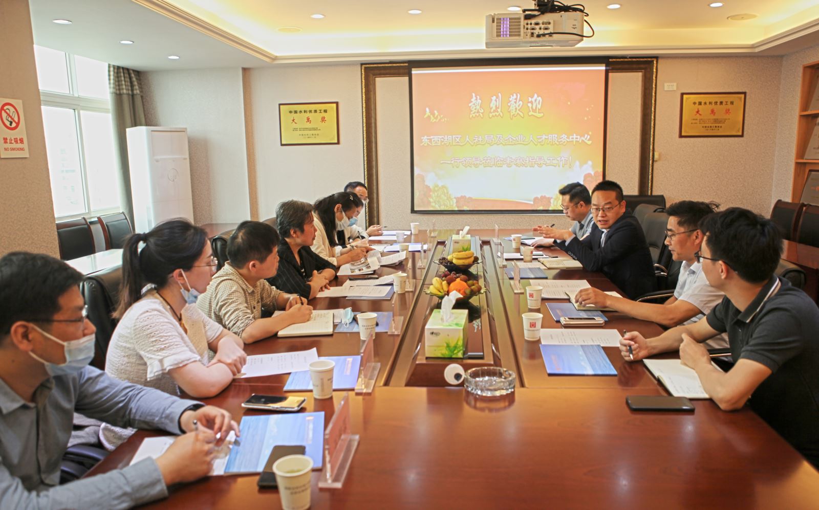 为保障2022年度职称评审工作顺利有序开展,更好地宣传贯彻职称评审有关政策,5月9日,东西湖区人力资源和社会保障局及东西湖区企业和人才服务中心一行领导莅临公司交流指导工作,并在公司九楼会议室交流座谈。公司总经理胡刚、副总经理张常飞及人资行政部负责人参加交流座谈。