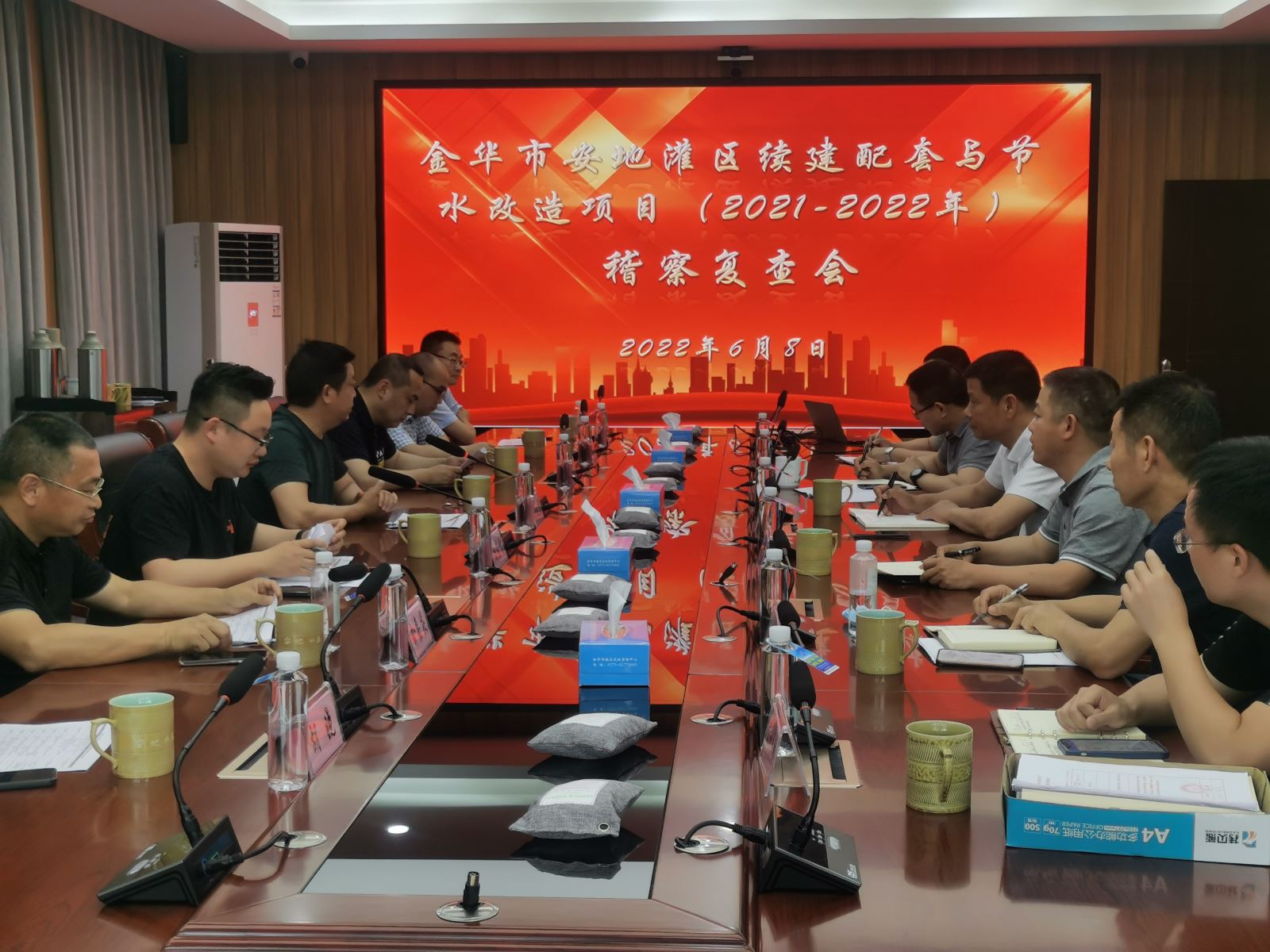 6月8日,浙江省水利厅副厅长韩连宏带领项目稽察复查组赴公司承建的金华市安地灌区续建配套与节水改造项目(2021-2022)1标段开展专项稽察复查工作,金华市水利局副局长潘旭臣、金华市水利规划建设和质量安全管理中心主任陈智和及各参建单位主要负责人陪同。