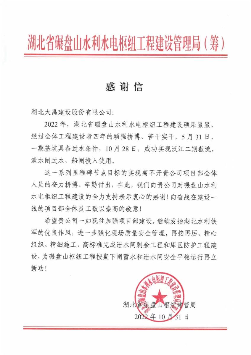 近日,公司碾盘山枢纽项目部收到了湖北省碾盘山水利水电枢纽工程建设管理局(筹)的感谢信,信中给予了对公司碾盘山水利水电枢纽工程建设工作的肯定和赞许。