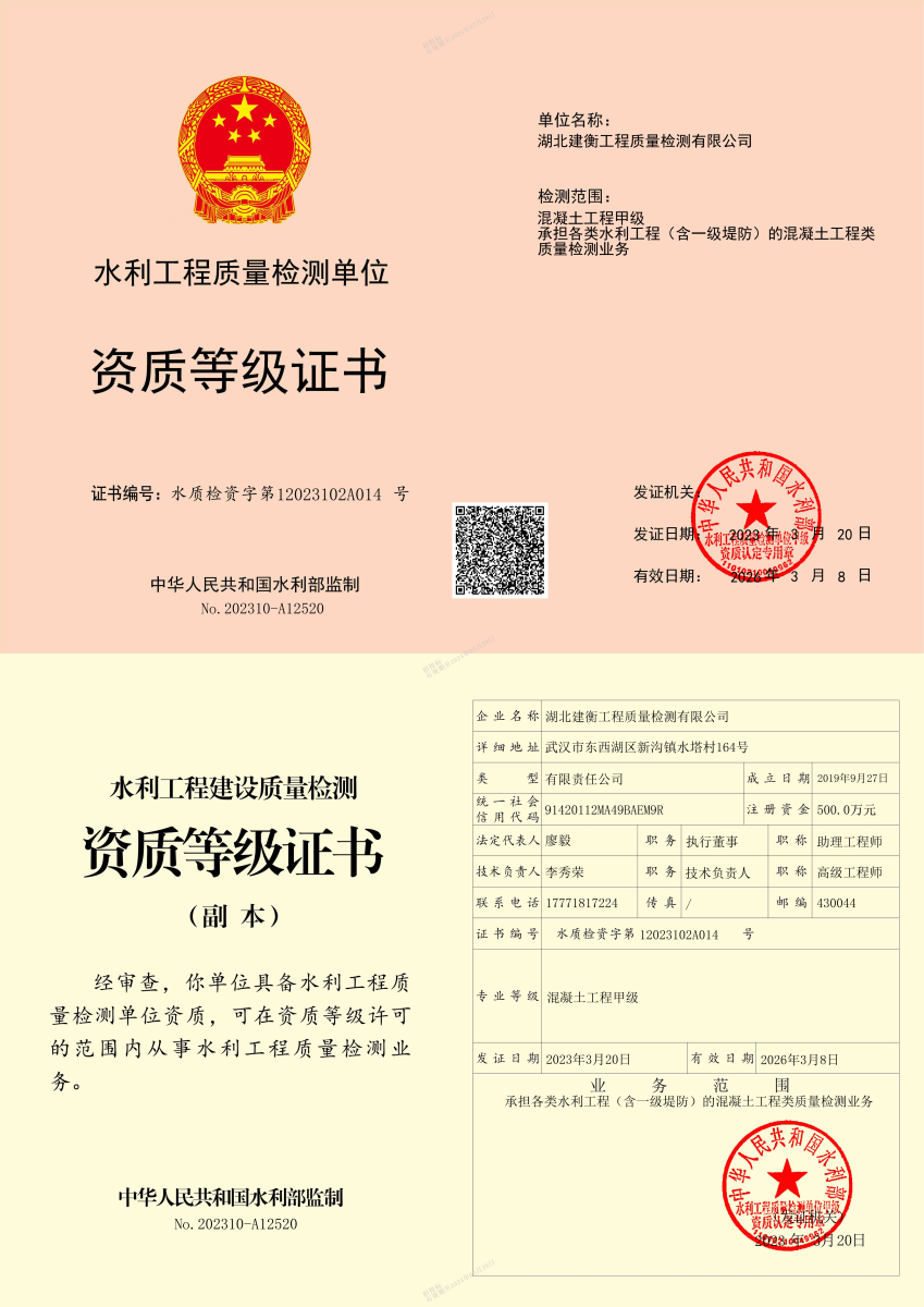 混凝土工程甲级资质的获得,使建衡检测公司可以承担各类水利工程(含一级堤防)的混凝土类质量检测业务,进一步拓宽水利工程质量检测市场服务范围,为建衡检测公司在水利市场上抢抓机遇,向更高层次、更高水平、更宽领域发展提供了一定保障。下一步,公司将持续推进岩土、量测、金属结构、机械电气类检测资质升级工作,进一步开创事业发展新局面,以一流的检验检测服务为工程质量保驾护航。