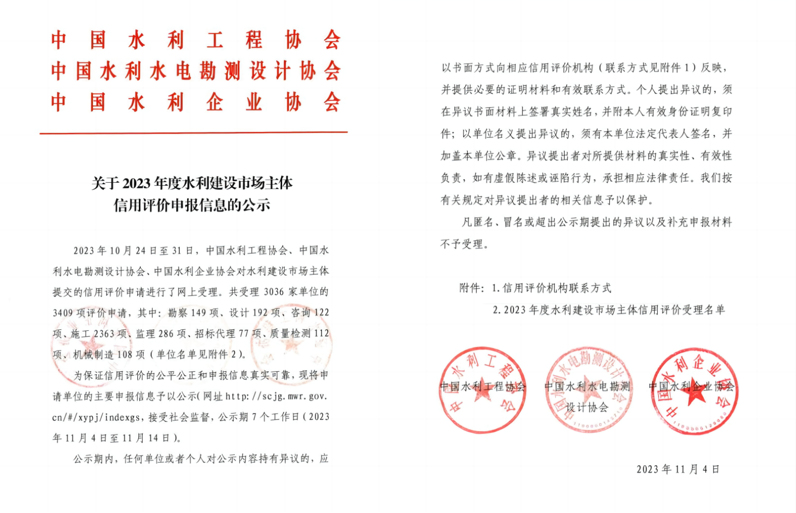 目前,公司信用评价申请已经协会网上受理,根据《水利建设市场主体信用信息管理办法》等相关规定,申报信息正进行全网公示。下一步,公司将持续完善水利建设市场信用信息平台建设运营工作,推进企业诚信建设,规范水利建设市场主体行为,进一步维护水利建设行业的健康发展。