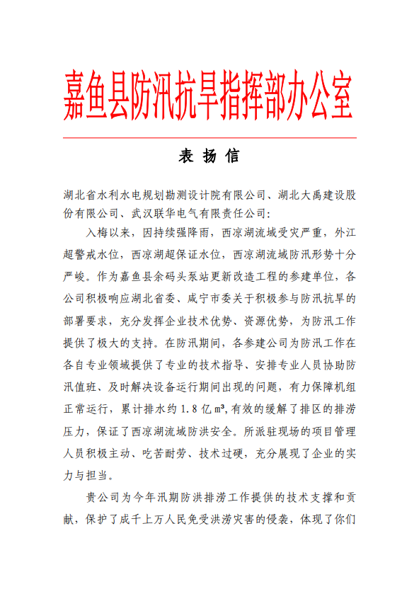 近日,嘉鱼县余码头泵站更新改造工程项目喜获嘉鱼县防汛抗旱指挥部表扬信,信中充分肯定公司积极响应湖北省委、咸宁市委关于积极参与防汛抗旱的部署要求,充分发挥企业技术优势、资源优势,为防汛工作提供了极大的支持。