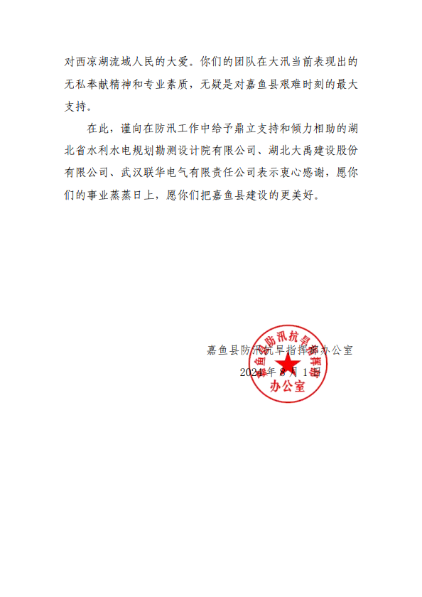 信中指出,入梅以来,因持续强降雨,西凉湖流域受灾严重,外江超警戒水位,西凉湖超保证水位,西凉湖流域防汛形势十分严峻。作为嘉鱼县余码头泵站更新改造工程的参建单位,伟德国际victor1946公司积极响应湖北省委、咸宁市委关于积极参与防汛抗旱的部署要求,充分发挥企业技术优势、资源优势,为防汛工作提供了极大的支持。在防汛期间,为防汛工作提供了专业的技术指导、安排专业人员协助防汛值班、及时解决设备运行期间出现的问题,有力保障机组正常运行,累计排水约1.8亿m³,有效的缓解了排区的排涝压力,保证了西凉湖流域防洪安全。所派驻现场的项目管理人员积极主动、吃苦耐劳、技术过硬,充分展现了企业的实力与担当。