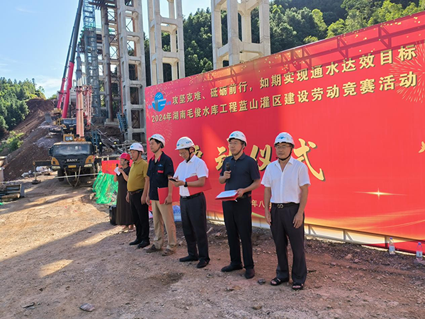 为加快推进毛俊水库工程建设,完成年初既定目标任务,8月22日,湖南毛俊水库工程举行“攻坚克难,砥砺前行,如期实现通水达效目标”劳动竞赛活动启动仪式。蓝山县委常委黄加葵、蓝山县人民政府副县长陈流三、湖南毛俊水库工程建设有限责任公司董事长成志明一行及各项目部主要人员参加仪式。