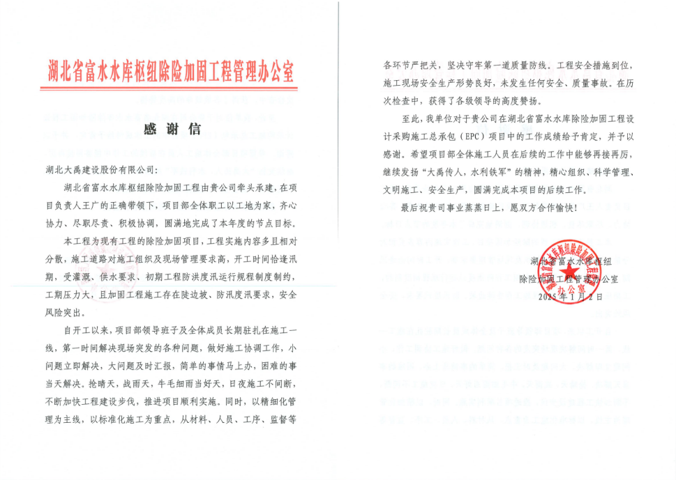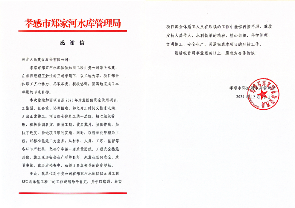 孝感市郑家河水库除险加固工程收到了孝感市郑家河水库管理局发来的感谢信,信中对公司在郑家河水库除险加固工程EPC总承包工程中的工作成绩给予肯定,并予以感谢。信中希望项目部全体施工人员在后续工作中再接再厉,精心组织、科学管理、文明施工、安全生产,圆满完成本项目的后续工作。