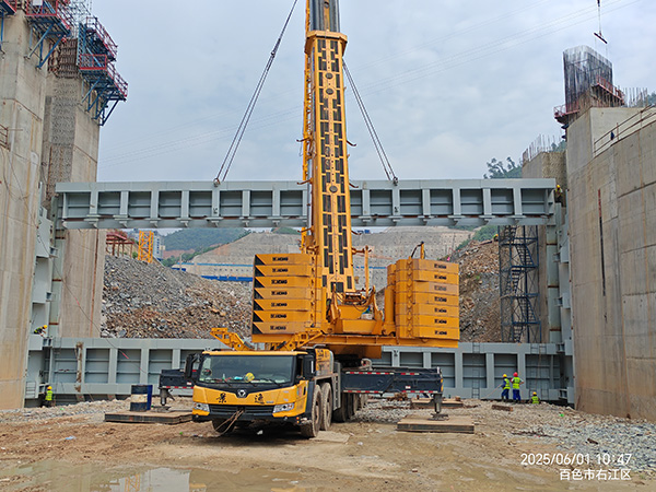 2025年5月28日至6月3日,广西百色水利枢纽通航设施工程辅助船闸开始陆续对闸工组件吊装。因受现场施工条件限制并考虑施工安全,故选用汽车吊安装,边梁最大吊距18米,构件最大吊重81.8吨;门叶最大吊距20米,构件最大吊重69吨。卸车时,将四根钢丝绳通过4个35t卸扣连接门叶卸车吊耳与吊车大钩卸车,结构件运输车辆离作业区域后,将闸门门叶分节结构件垫上枕木,平放在闸室底板上。依据闸门分节的实际情况(底节上下部有主梁;中间接顶部有主梁,底部无主梁;顶级中间部位有主梁),门叶分节结构件在出厂前已做好加固措施,以防止门叶结构件在装车、运输、卸车、翻身、吊装过程中产生变形。