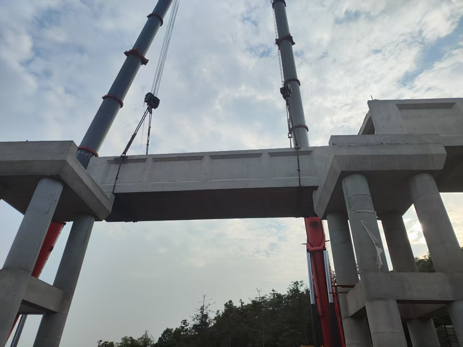 上午10时整,两台挖机准时抵达现场,对4#预制槽身的吊车站位区域进行了精心修整,确保站位平整、稳固,满足吊装作业的各项要求。下午5时左右,随着两台三一SAC700t吊车缓缓就位于渡槽流水方向的右便道作业平台,一场精密而有序的吊装作业正式拉开序幕。吊装过程中,操作人员先将预制槽身缓缓吊起至离地20cm~30cm的高度,进行短暂的试吊检查,确认一切正常后,两台吊车协同作业,以平稳而匀速的方式将槽身缓缓提升。最终,在下午6时左右,4#预制槽身准确无误地落入渡槽轴线位置,吊装任务取得圆满成功。