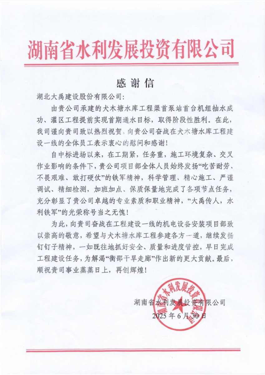 就在当日,公司还收到了一封来自湖南省水利发展投资有限公司的感谢信。信中,湖南省水利发展投资有限公司对公司在犬木塘水库工程渠首泵站施工中所取得的卓越工作成绩给予了高度肯定,并表达了诚挚的感谢。这封感谢信不仅是对公司过去努力的认可,更是对未来工作的激励与鞭策。