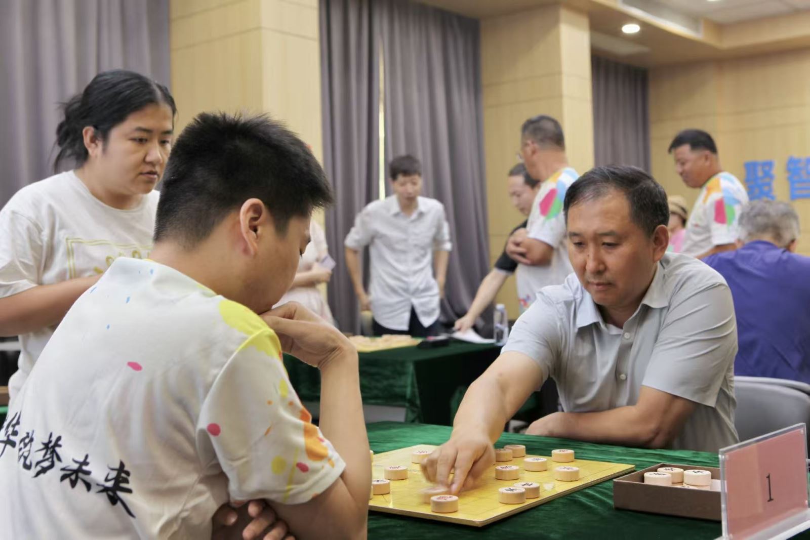 比赛现场,只听落子声此起彼伏,看似风平浪静,实则剑拔弩张。棋手们全神贯注,时而紧锁眉头陷入沉思,时而展颜欢笑似已觅得破局良策。在“楚河汉界”间,他们展开了一场场激烈争夺,充分彰显了中国象棋的独特韵味与深厚底蕴。