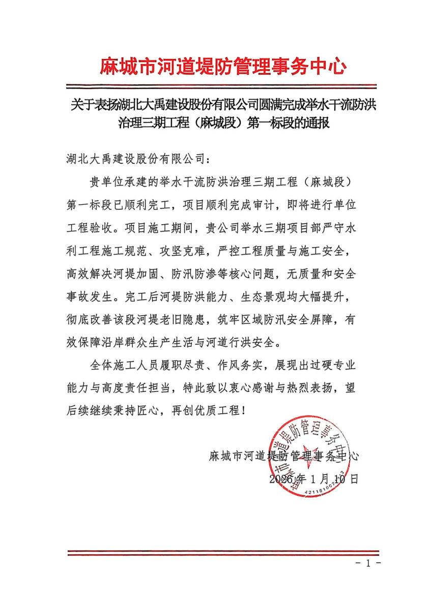 近日,公司收到麻城市河道堤防管理事务中心发来的表扬信,对公司承建的举水干流防洪治理三期工程(麻城段)第一标段建设工作给予高度评价,并对项目团队履职尽责、作风务实的专业能力和高度的责任担当表示衷心感谢与热烈赞扬。